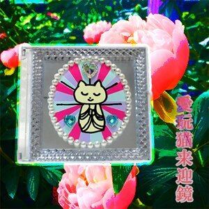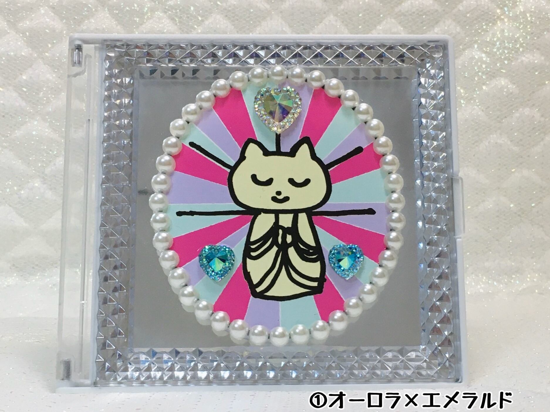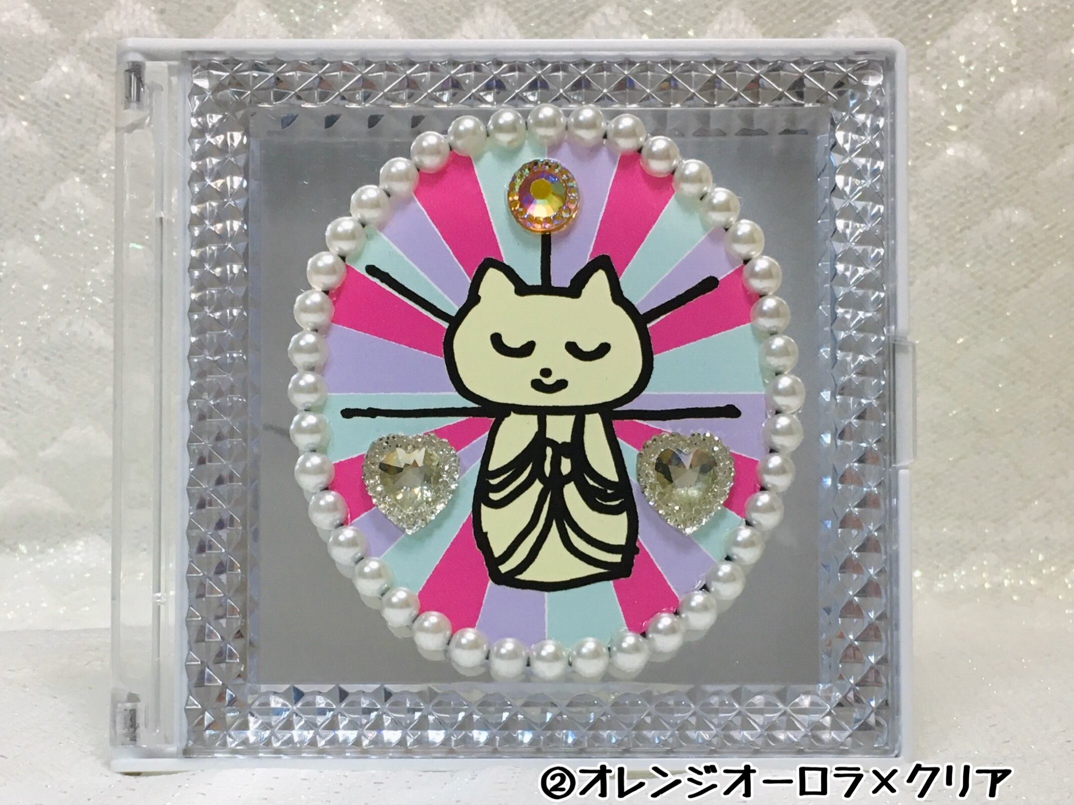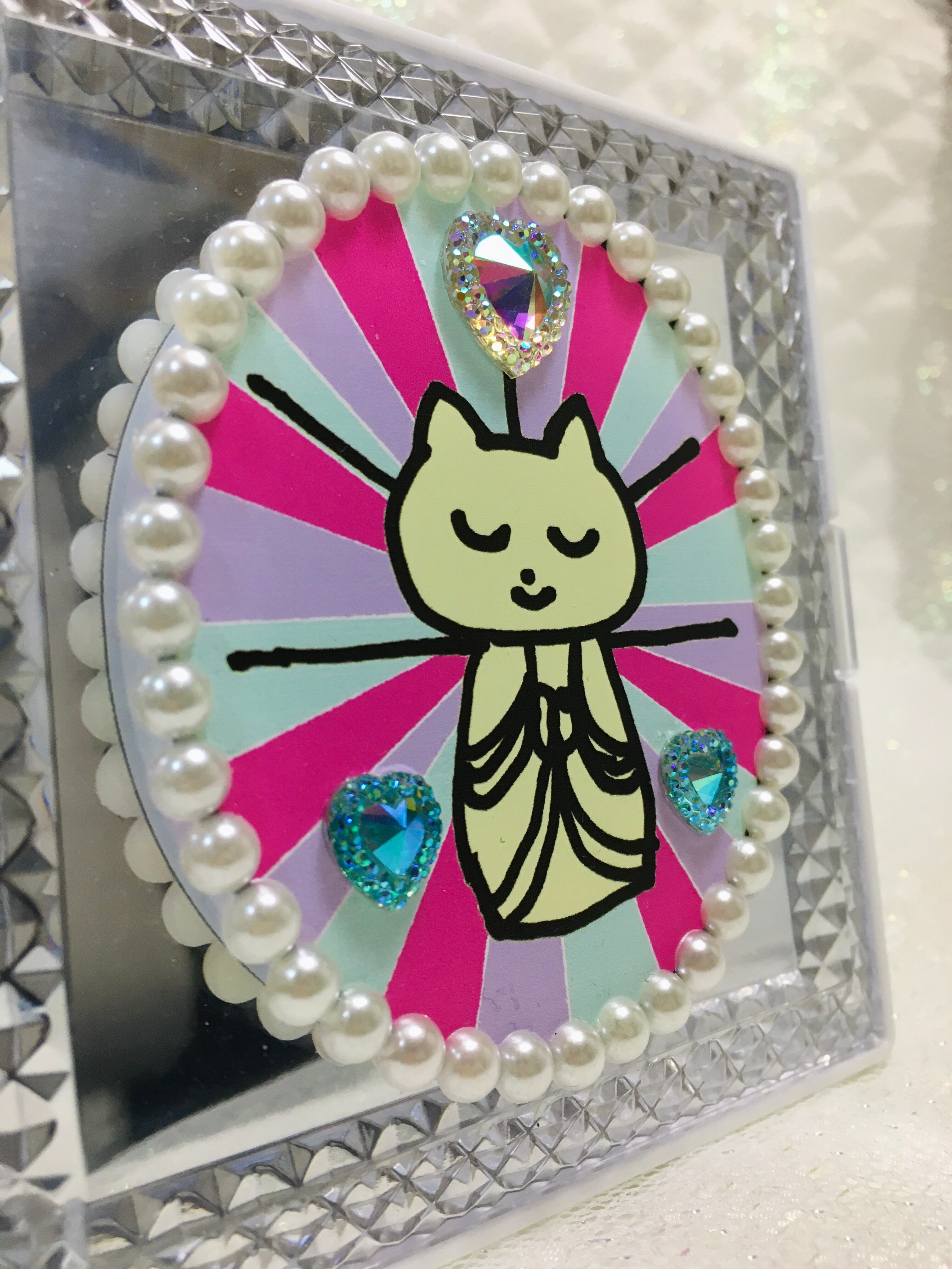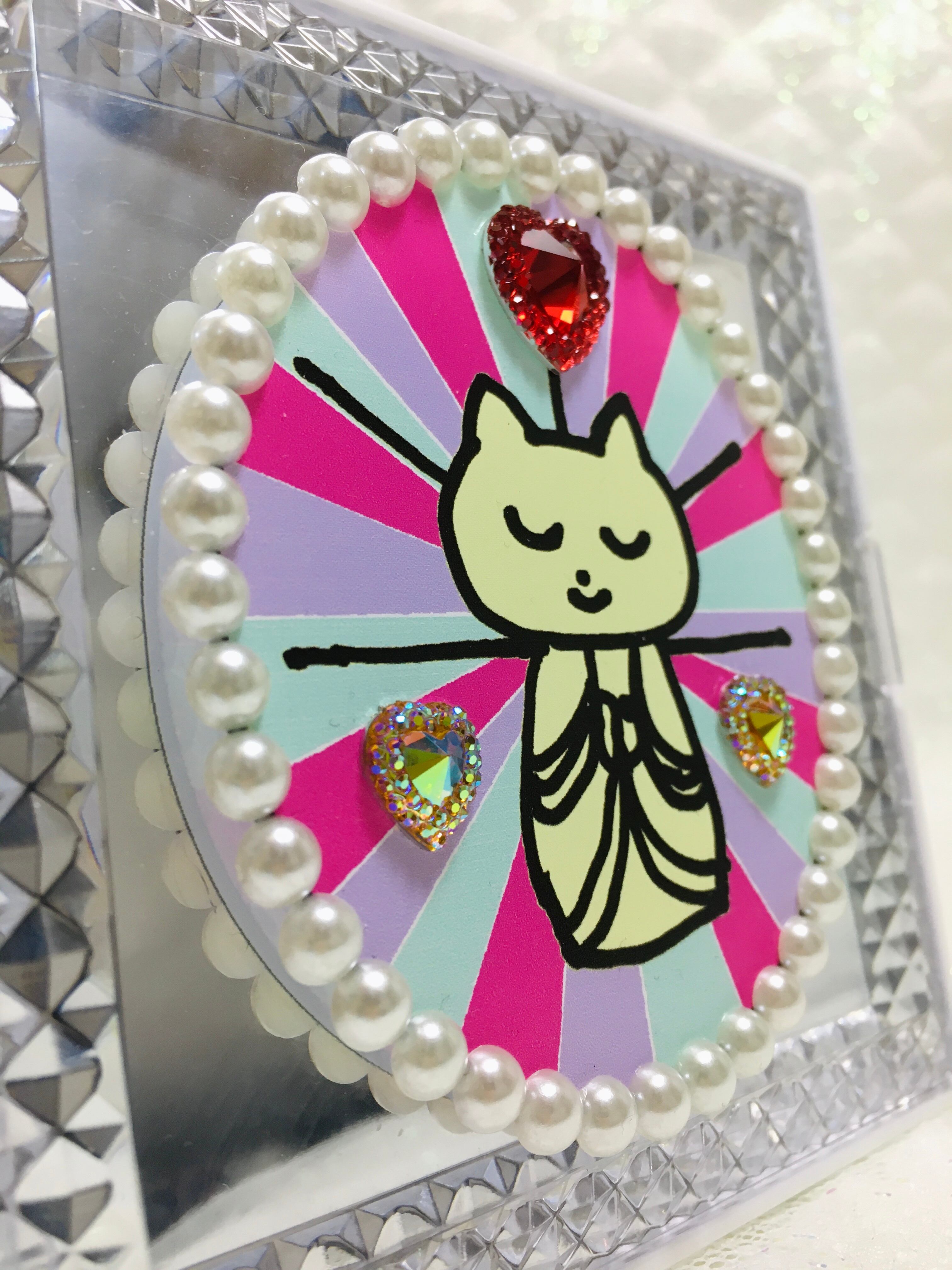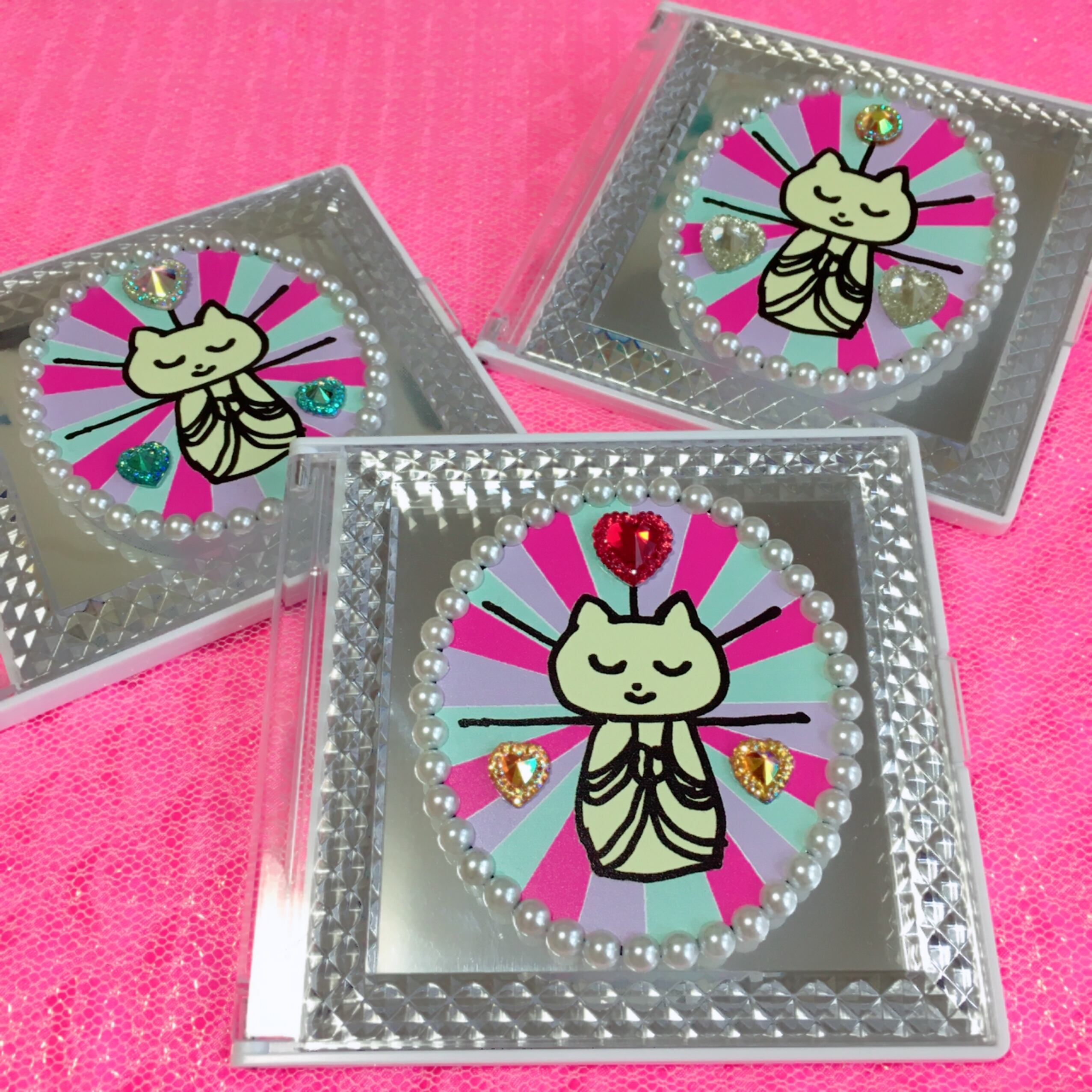 ねこちゃん観音プリントのオリジナルデコミラー。スクエア型で使いやすさもばつぐん。レトロ配色のイラストと、ミステリアスなストーン配置がこだわりです!